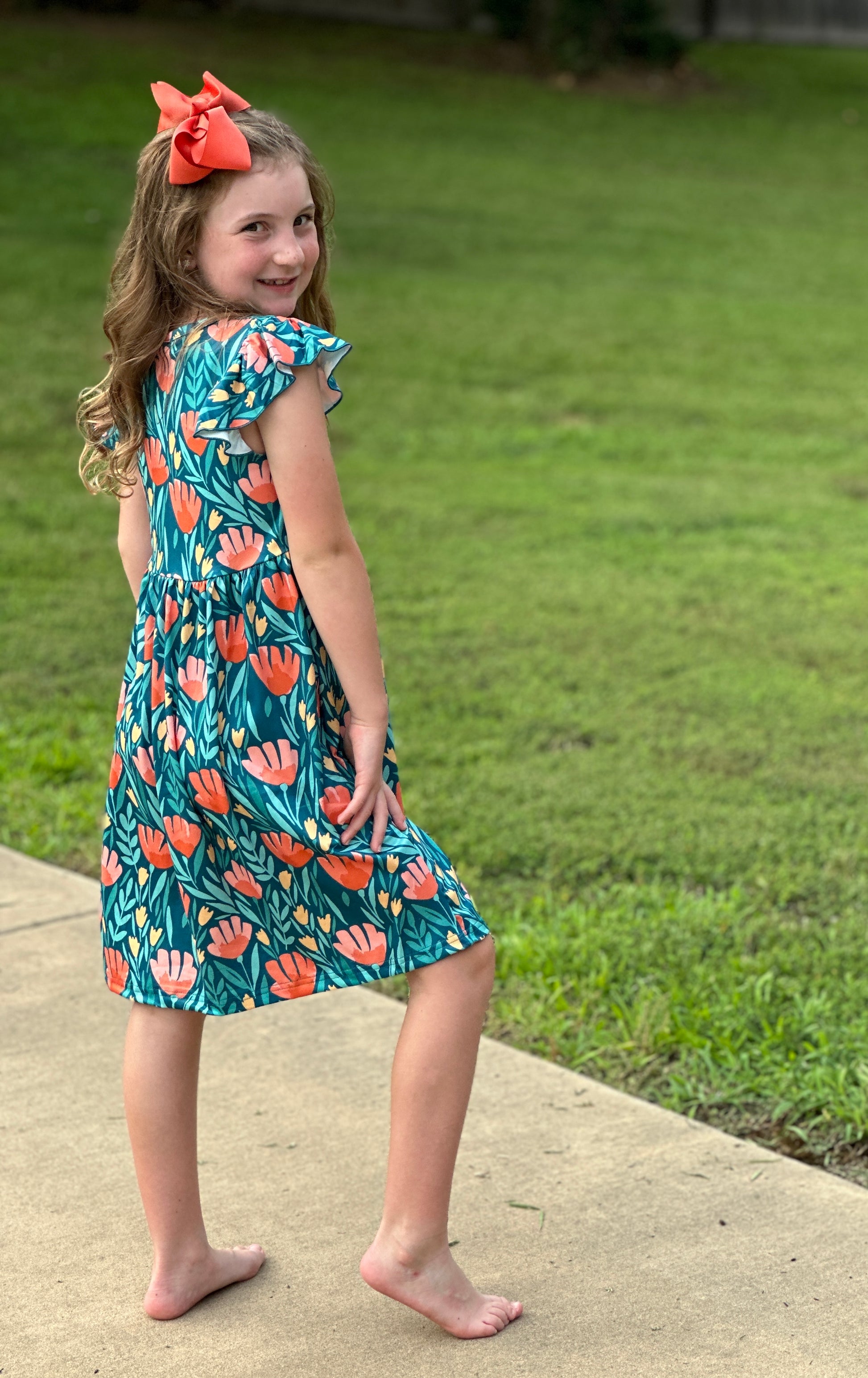 Girls Teal Floral Print Flutter Sleeve dress. Baby soft for maximum comfort and cuteness!