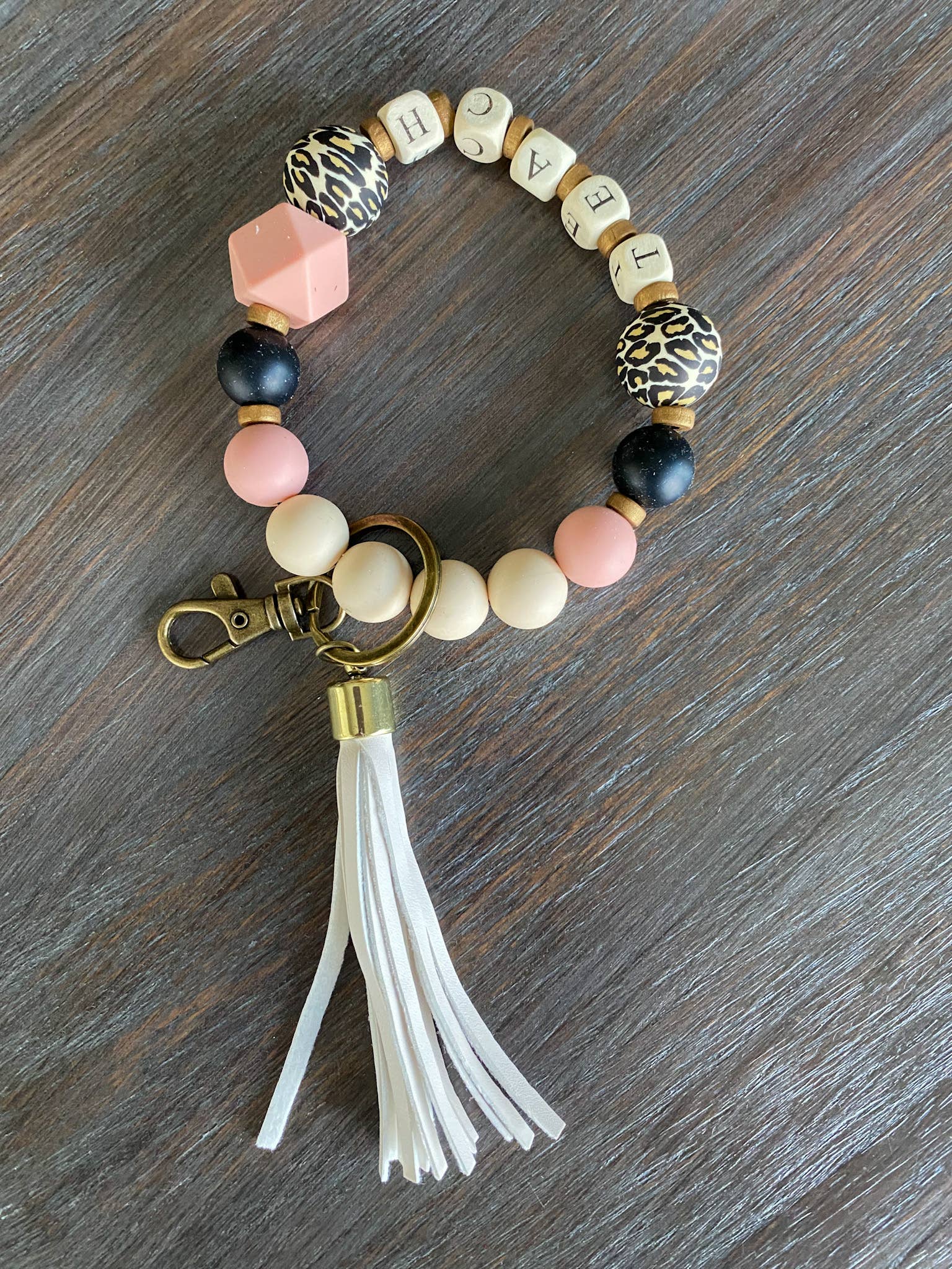 These are made with cute stamped TEACH wood beads. The accent beads are our soft and durable silicone. They are the perfect teacher's gift. They are individually wrapped so they stay nice in shipping. They are cute accent to any bag or use for a luggage tag. You can easily find your keys in any bag with this attached. An easy grab and go gift to keep at the register for add on $.